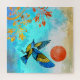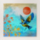 Este lindo design retrata um pássaro azul e dourado fazendo uma aterrissagem em uma árvore ouro com um belo céu de muitas cores azuis e um sol laranja ousado.