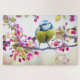 Uma quebra-cabeça com uma fotografia incrível do pássaro mais bonito empoleirado em um galho coberto de flores rosa e folhas verdes. O pássaro tem uma cabeça azul e corpo amarelo com um rosto muito doce. Adorável.