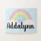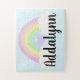 Personalize com o nome da criança para um presente divertido perfeito para qualquer ocasião. Este quebra-cabeça apresenta um fundo azul do céu com um design de arco-íris colorido, colorido d'água, cheio de coração e nuvens.