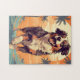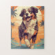Design de arte vívida colorida de um pastor australiano numa praia tropical.