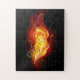 Pena de pavão brilhante feita de fogo e chamas sobre fundo negro.