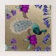 Um pavão colorido é empoleirado num galho adornado com flores vibrantes. O fundo apresenta um tom dourado com detalhes texturizados, melhorando a elegância geral da cena.
