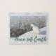 Foto admirável de um pato branco junto com patos-reais na água gelada com a citação Paz na Terra em uma letra de modinha. Esta quebra-cabeça tem uma camada suave e invertida de flocos de neve, presente perfeito para amantes da natureza.