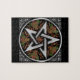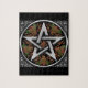 Design celta artístico do pentagram no metal de prata lustrado. dragões derespiração no vermelho e no verde. Rolo-work de canto intrincado. Presente elegante para Wiccans, Pagans, seguidores das religiões da terra.