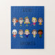 Quebra-cabeça com pequenos personagens de desenho animados e nome personalizado de criança.