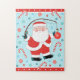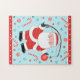 Quebra-cabeça de Natal de pesca com pescador de Papai Noel, segurando uma vara de pesca com ornamento no anzol, cercada de doces de Natal.