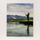 Pescar num lago de montanha num belo dia ensolarado com montanhas de neve ao fundo. A natureza é bela.