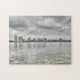 Aqui está a bela linha do horizonte de Filadélfia, vista do outro lado do rio Delaware, cidade de Camden. As nuvens se pendura no céu tempestuoso, e as reflexões dos arranha-céus são vistas na água.