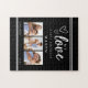 Photo Collage Modern Black Happy Birthday jigsaw puzzle. Celebrate his birthday with a personal touch using this 'My Love' photo collage. This design features a romantic black background with elegant white script that reads 'My Love' and custom 'Happy Birthday' message. Three of your favorite cherished memories are showcased in a photo collage layout, making it a truly unique and heartfelt gift. This is a perfect way to show your appreciation and love on his special day, creating a memorable keepsake he'll treasure forever. Perfect gift for your puzzle lover boyfriend or husband this year for his birthday!