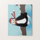Um adorável cachecol xadrez vestindo pinguim desfruta de um dia de inverno com algum gelo patinando em um quebra-cabeça
