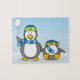 Um pequeno desenho animado de pinguim com bola de neve e um desmaiado.