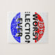 Os piores candidatos de sempre. Círculo em vermelho, azul e branco, texto em preto com contornos brancos. Efeito perturbado aplicado ao design.