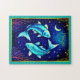 Puzzle in a Pisces illustration featuring two turquoise blue fish swimming in opposite directions against a starry, deep blue background. A crescent moon and stars enhance the celestial theme, evoking the imaginative spirit of the Pisces zodiac sign.