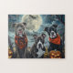 Libere o espírito assustador com esta design sombria do Dia das Bruxas apresentando um bando de cachorros sob um céu escuro e iluminado, cercado por morcegos voadores e abóboras brilhantes. Perfeito para aqueles que amam um toque de diversão terrível com seus amigos peludos!
