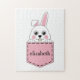 Uma ilustração de um belo coelho branco a espreitar no bolso rosa. Este adorável design de coelho branco é uma ideia presente para amantes de coelhos, mãe de pelo, pai de pelo, amantes de animais de estimação e amantes de os animais. Personalize ou personalize este quebra-cabeça de quebra- cabeça adicionando seu próprio texto.