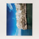 Quebra-cabeça de serra de vaivém da foto com as casas construídas em um penhasco no mar Mediterrâneo na cidade Polignano da praia uma égua na costa oriental de Puglia no sul de Italia em um dia de verão bonito.