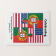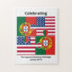Design da bandeira Patriótica PORTUGUESA AMERICANA, mostrando a bandeira de PORTUGAL e a bandeira Estrelas e Stripes dos ESTADOS UNIDOS DA AMÉRICA, conectada em formas de peças de serra. O texto diz CELEBRAÇÃO DO PATRIMÔNIO PORTUGUÊS-AMERICANO. Todo o texto é PERSONALIZÁVEL, para que você possa criar seu próprio e adicionar seu nome. Especialmente concebido para comemorar o Dia de Portugal e os eventos do Patrimônio Português. Itens correspondentes disponíveis, para que você possa comemorar seu evento no estilo. Envie-me um e-mail para solicitações especiais.