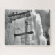 Divirta-se colocando o quebra-cabeça de serra de neve "Postas na neve" juntos. Uma imagem de duas madeira posta na neve com densas nuvens peludas num dia ensolarado ao fundo. Feito em preto e branco.