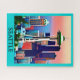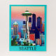 Quebra-cabeça num poster de viagens de Seattle, no horizonte de Washington, sob um céu amanhecido, em tons de turquesa e rosa-coral
