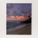 A luz do sol a desaparecer criando lindas matizes cor-de-rosa e laranja no céu, silhuetas fazeres das palmeiras e realçando o surf suave. Cena de praia tranquila.