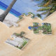 Quebra-cabeça de serra de praia com palmeiras de coco à beira-mar. Quebra-cabeça de Jigserte ajudam a relaxar e aliviar seu estresse. A última tendência em autocuidados é fazer quebra-cabeça de quebra-cabeça como uma prática meditativa.