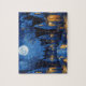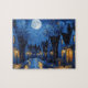 El contraste entre los amarillos dorados de la luz artificial y los azules profundos y negros del cielo y las sombras confiere a la escena una calidad onírica y muy emotiva. El diseño evoca un sentido de confort, misterio y vida nocturna apacible, ideal para los amantes del arte que aprecian la intensidad del color y la textura.
