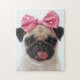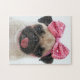 Pug dog com a língua para fora com uma fita cor-de-rosa, fundo branco.