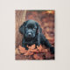 Este quebra-cabeça apresenta um filhote preto bonito de labrador, descansando em uma pilha de folhas.