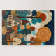 Discover the intricate beauty of this quilted folk art village. This digital illustration mimics the cozy texture of patchwork fabric and ceramic mosaics, featuring a whimsical town nestled under a giant, ornate sun. The stylized trees and cottages are rendered with detailed patterns—resembling embroidery stitches and woven textiles—in a rich palette of teal, rust orange, and cream. A perfect statement piece for boho living rooms, craft rooms, or as a challenging and beautiful jigsaw puzzle.