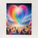 Love all over the world in the shape of a muti-colored heart. floating high in the sky over all of the people.