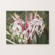 quebra-cabeça de quebra-cabeça de 11" x 14" com uma imagem de uma pintura de aquarela de realismo extremo de hambúrgueres e brancos Rainha Emma ou Lírios Gigantes de Aranha (Nome botânico: Crinum augustum). Nativo das Seychelles e da Maurícia no oceano Índico ocidental, os lírios da Rainha Emma crescem e crescem vigorosamente em condições adequadas, e florescem continuamente, mas mais fortemente no período de primavera. Os caules espinhosos, arrojados e suculentos de flores são derramados por grupos de aranha tipo maria de grandes flores perfumadas com estreitas pétalas cor-de-rosa-pálido a quase brancas. Veja toda a coleção de Quebra-cabeça de Flores e Plantas na seção HOME.