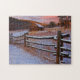 Esta foto caracteriza um celeiro rústico coberto de neve na frente de um por do sol bonito em um rancho de Colorado.