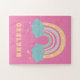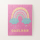 Uma quebra-cabeça engraçadinha para uma garotinha, que trará muito prazer quando ela ver seu nome! Esse design apresenta uma ilustração de um arco-íris pastel com nuvens e corações, em amarelo, teal e lilás, em fundo rosa. O nome da criança está em negrito amarelo, com letra lúdica. Excelente de ensinar uma criança a reconhecer e soletrar seu nome.