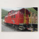 Foto de uma caboseira vermelha que se ergue na retaguarda de uma cidade histórica de mineração de carvão
