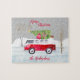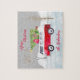 Red Truck Feliz Cinza de Natal quebra-cabeça. Personalize adicionando seu nome de família e mudando a frase do Feliz Natal. Itens correspondentes disponíveis.