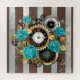 Relógio antigo e patenteado, adornado com joias, mãos de ouro e algarismos latinos com rosa de turquesa sobre fundo castanho e listrado. Estilo Steampunk.