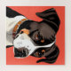 Ilustração estilizada de um cão preto e branco na vista do perfil, com um pano de fundo vermelho vibrante enfatizando a elegante silhueta do cão enquanto mostrava seu encanto.