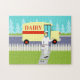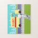 Se você tem uma sede para um design moderno do meio século, este quebra-cabeça retro do Milkman da cidade pequena é para você! O estilo dos anos 60, características de design minimalistas da arte um dedicado, milkman que faz sua manhã arredonda-se. O homem louro está vestindo calças, a camisa e o chapéu brancos leitosos com um laço, uma correia e uns calçados pretos. Este homem de entrega do cálcio e da vitamina D está andando acima de um passeio dianteiro, levando a fonte semanal de uma família do leite integral, fresco nas garrafas de vidro. O jornal de manhã está ainda no passeio. Não se preocupe. Somente a boa notícia é permitida nesta cidade! O passeio é cercado pelo tipo de gramado verde encontrado somente em cidades pequenas e em subúrbio. Há igualmente um branco, cerca de piquete. Na rua, nós vemos o passeio doce do milkman! É um amarelo cremoso, caminhão do leite com uma listra vermelha no lado e a rotulação vermelha que diz, "LEITERIA". No lado oposto da rua, nós vemos um céu do aqua e a luz - silhuetas azuis de árvores de cedro. Estes desenhos animados kitschy olham como uma cena fora de uma comédia velha da televisão. Traga no bolo amarelo com glacé do chocolate--o bolo oficial de todas as donas de casa da televisão e de suas famílias afortunadas! Os ossos fortes de construção nunca provaram tão bons!