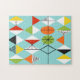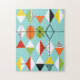 Este quebra-cabeça retro do teste padrão do Harlequin é estilo moderno do meio século no seu mais fino. O vintage inspirou características que de design um fundo do aqua com fileiras das formas triangulares que formam um harlequin modela. As formas dois-tonificadas do diamante são amarelas, brancas, vermelhas, alaranjadas, pretas, verdes, e branco com acentos pretos. Mas a espera, lá é mais! Há igualmente uns ovals alaranjados, uns ovals verdes com starbursts pretos, e uns esboços dos carvões. O tempo marcha sobre, mas você sentirá como você encontrou uma explosão kitschy do passado com este tesouro geométrico colorido.