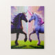 Dois unicórnios se encontram, uma luz escura, cada um com chifres multicoloridos, e unem forças! (IA gerado)