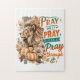 Design cor e pacífica apresentando uma cena de outono/outono com a majestosa cabeça de leão, abóboras e flores de outono. O texto colorido inspiracional diz: "Rezem nele, rezem por cima dele, rezem através dele". Esse design está disponível em uma grande variedade de produtos.
