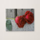 Um quebra-cabeça com uma foto de duas rosas vermelhas sobre um fundo de madeira de galho.