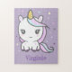 Um quebra-cabeça roxo com um unicórnio fofo em cor pastel e um nome próprio personalizável: uma boa ideia de presente para uma adolescente que ama animais de fantasia Kawaii!