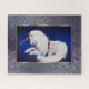 Um design semitríficio com rolhas de ouro sobre roldanas de ouro que cortam intencionalmente para tornar este quebra-cabeça um pouco mais difícil, apresenta um belo unicórnio branco que repousa sobre um fundo azul real sombreado - ela veste uma poinsettia vermelha e uma coroa oca à volta do pescoço e seu chifre é dourado e listras vermelhas na diagonal com um brilho na ponta - sua mão e cauda são magicamente maravilhoso - As cores apresentadas são vermelho, branco, azul real e ouro Arte original e design por © WhimsicalArtwork™
