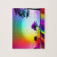 Quem sabe onde é que esta via colorida do arco-íris vai levar? Uma cidade distante e desbotada é vista ao fundo, passando por árvores roxas e silhuetas.