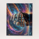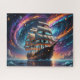 Um navio alto sob cheio de velas de vela por um mar calmo sob um céu colorido, mágico de galáxias, planetas e estrelas. Imagem linda e sonhadora.