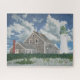 A painting of the lighthouse keeper's house and lighthouse on Cedar Point in Scituate, Massachusetts. The lighthouse sits at the entrance of Scituate Harbor. It was built in 1811 and is the eleventh lighthouse built in the United States (fifth oldest in New England). Scituate light was constructed using granite blocks to support the copper beacon. It is most famous for being the site where the daughters of the lighthouse keeper, Abigail and Rebecca Bates, fooled invading British troops into thinking the militia had arrived by playing a fife and drum as loudly as they could. They became known as the War of 1812's "American Army of Two".