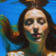 "Selene" - Mulheres Na Água. Nesta cena da água serena e colorida de mulheres de arte fina, uma bela mulher com cabelos longos e vermelhos flutua num mar azul girando. A luz do sol anuncia sua face pacífica sob a superfície da água. Com os olhos fechados e a face erguida, ela absorve a luz, incorporando uma figura forte, resiliente e inspiradora nesta imagem multicolorida.