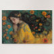 Senhora Dormindo na quebra-cabeça de serra amarela. © Jigsen Wonderland em Zazzle. Uma bela senhora de amarelo dorme entre as flores.