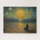 Nesta pintura surrealista, lembrando o estilo de Van Gogh, testemunhamos um mundo como o sonho: uma praia serena onde a realidade parece alterada, quase alucinatória. O mar, belo e etéreo, faz fronteira com este mundo surreal. A característica mais marcante é o céu, pontilhado com mil luas, cada uma lançando sua própria luz gentil e criando um mosaico mesmerante de beleza lunar. Esta cena convida à contemplação, misturando a tranquilidade de um cenário de praia com a surreal, sonhadora qualidade das múltiplas luas. É uma representação visual de um mundo surreal, onde o comum se transforma em extraordinário, e a praia familiar se transforma em uma porta para um reino da imaginação e da maravilha.